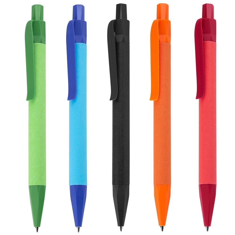Caneta de papel reciclado com detalhes plásticos, carga esferográfica azul e acionamento por clique.